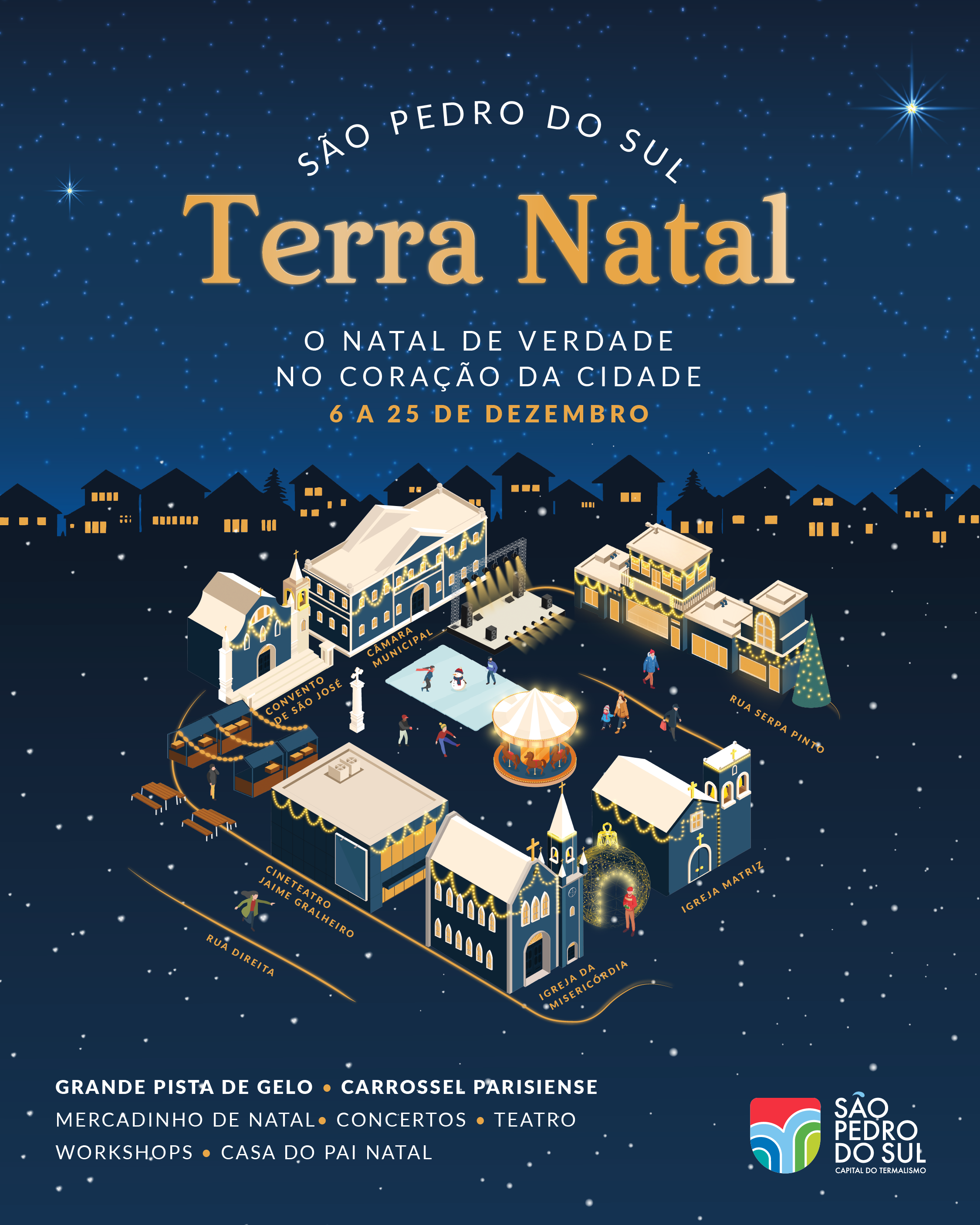 Cultura Destaques Eventos Região Dezembro 3, 2025Dezembro 3, 2025 O espírito natalício volta a iluminar o centro de São Pedro do Sul com o arranque do evento Terra Natal, já no próximo sábado, 6 de dezembro, e decorre até 25 de dezembro, com o mote “O Natal de Verdade no Coração da Cidade”.